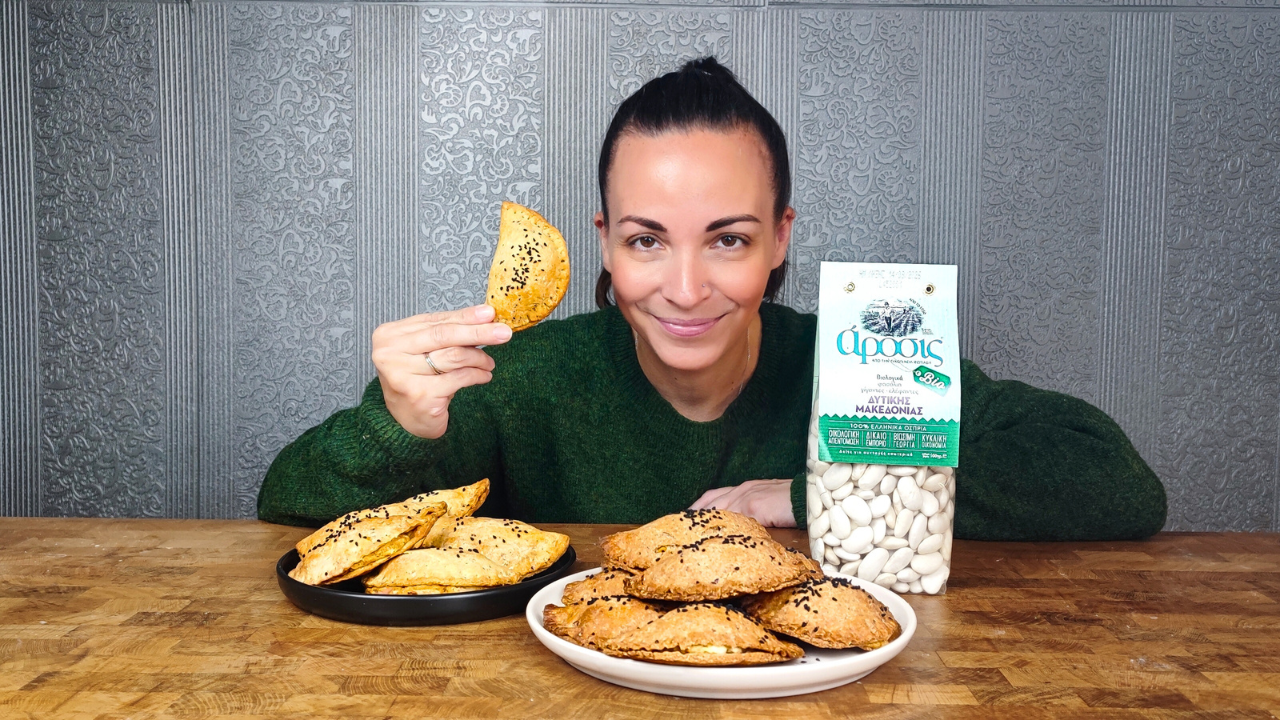 4. Ανάμεσα σε δύο κομμάτια αντικολλητικό χαρτί ανοίγω τη ζύμη και σχηματίζω στρογγυλά πιτάκια. Βάζω στο κάθε πιτάκι 1-2 κ.γ. από το μείγμα και κλείνω καλά. Σφραγίζω με ένα πιρούνι. Αλείφω με ελαιόλαδο και ρίχνω από πάνω και σουσάμι αν θέλω.
